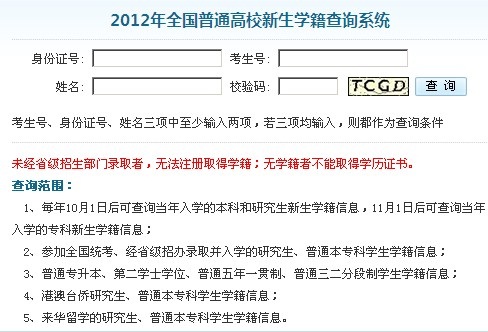 1.查询方法:登录“全国普通高校新生学籍查询系统”(http://xjxl.chsi.com.cn/xscx.do),输入考生号、身份证号、姓名三项中至少两项及校验码(如图1),可查询本人的学籍信息,包含姓名、院校名称、专业名称、学籍状态(如图2)。